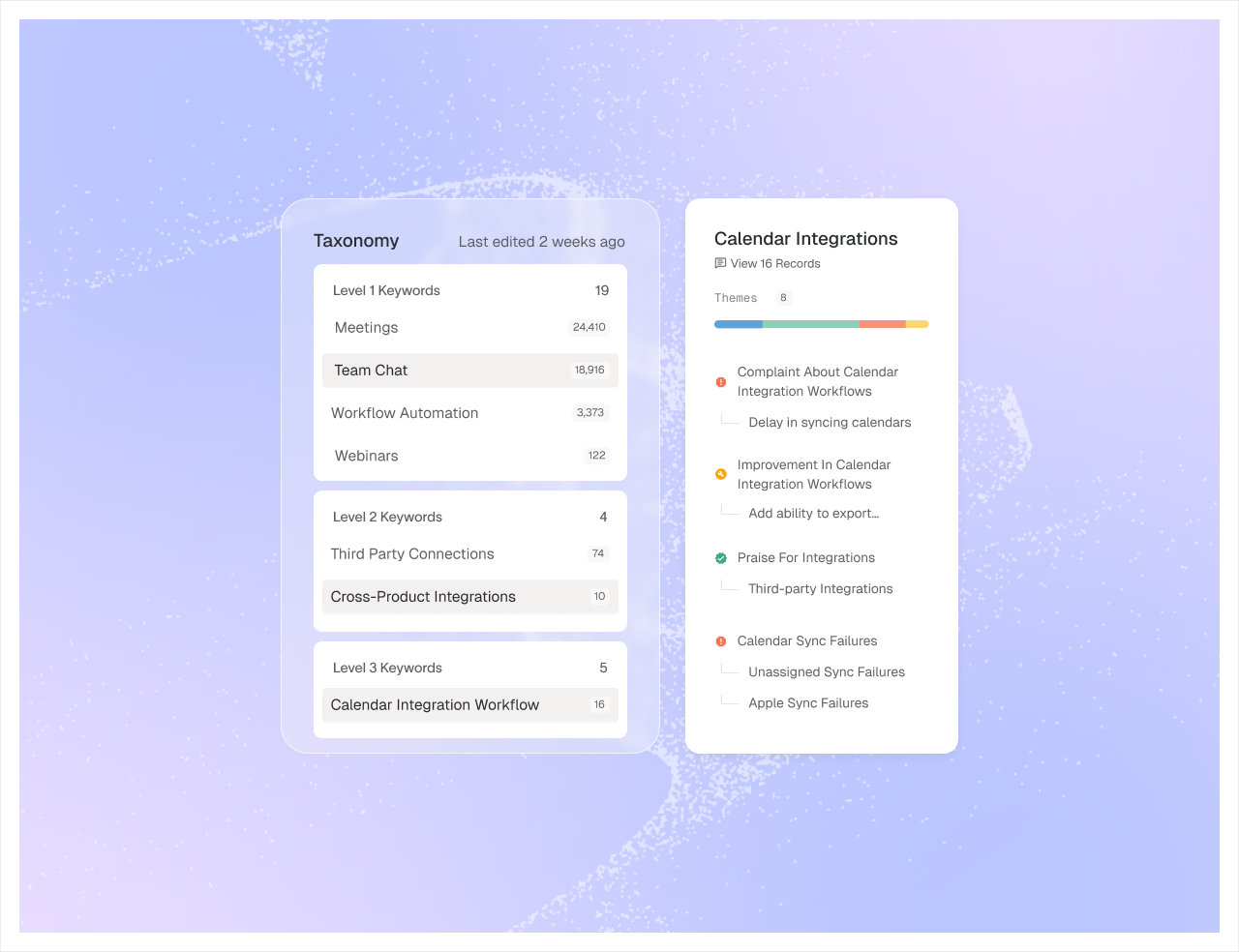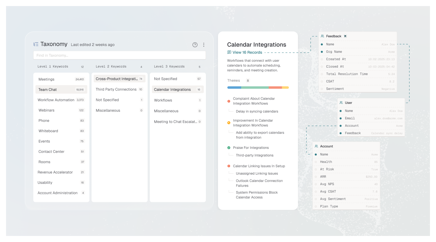 Let AI handle the heavy lifting by unifying feedback and structuring it into layered, customizable themes and reasons