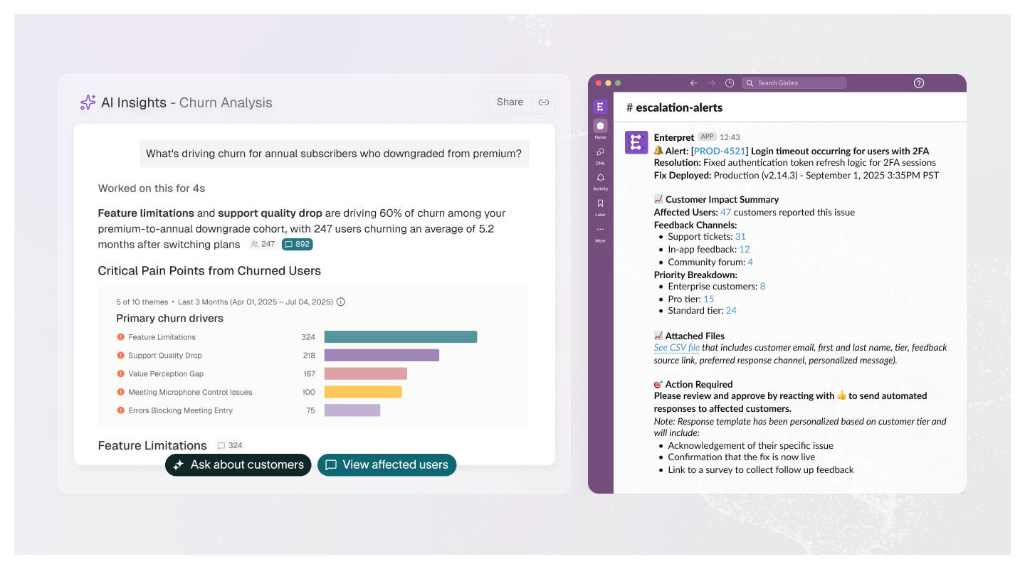 • Use natural language to instantly get answers and data on customer issues and feedback trends