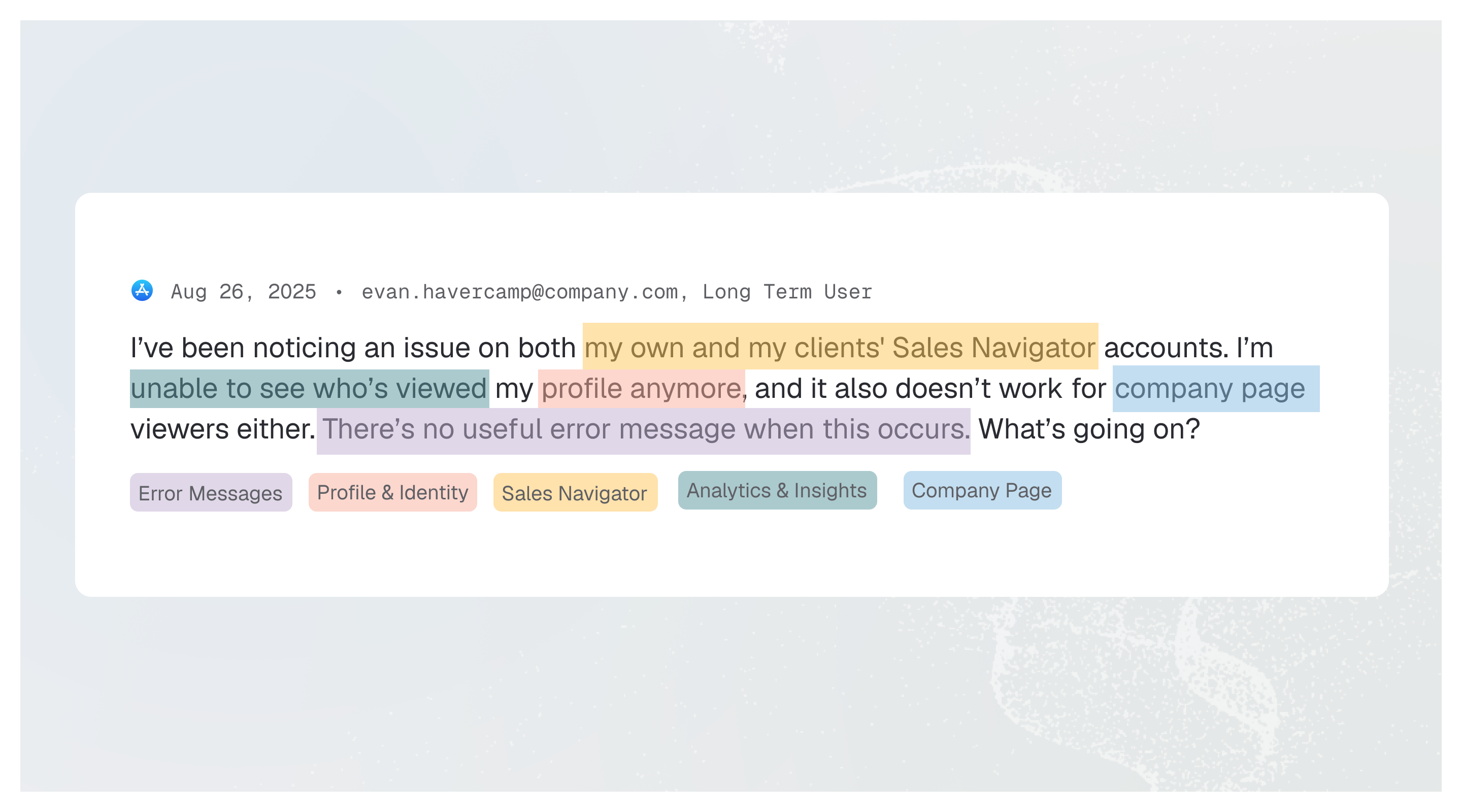 Feedback lives everywhere, making context hard to track. Unify feedback across 50+ sources into one real-time view.