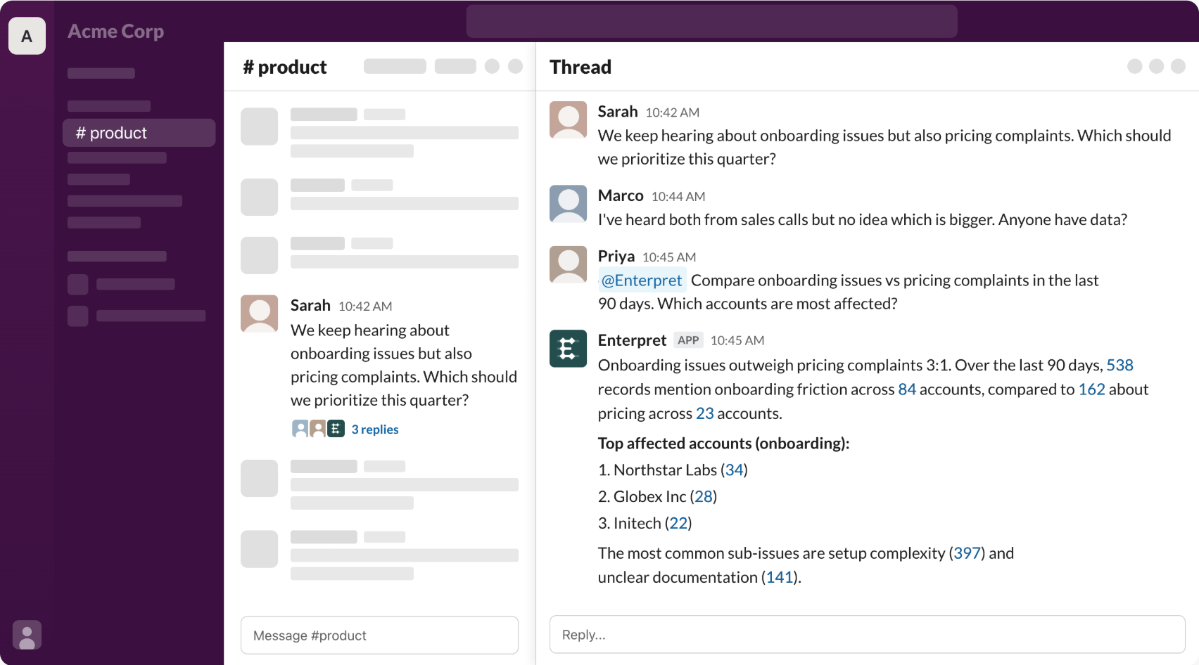 "Here's what customers said this week" is a digest. "@Enterpret, what are enterprise customers saying about our mobile experience?" asked live in a thread, with a cited answer in seconds, that's a different thing entirely. That's what Enterpret on Slack is built for: anyone in your workspace can @mention it in a channel, ask a question in plain English, and get an answer drawn from your actual feedback corpus, with sources linked back to real records.