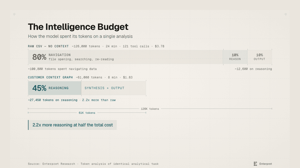 Roughly 80% of the token budget went to this kind of work: opening, searching, counting, re-reading. Only 10% went to reasoning. Out of ~126,000 tokens consumed, the model spent 12,600 actually thinking about customers. The rest was overhead.