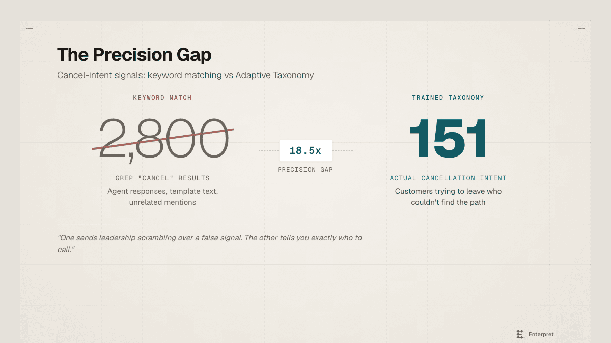 The cancel-intent example sharpens the point. Searching raw tickets for "cancel" returned 2,800 lines: agent responses ("I've cancelled the duplicate charge"), template text, unrelated mentions. It looks like a crisis. The structured taxonomy identified 151 actual cancellation-intent insights: customers trying to leave who couldn't find the path.