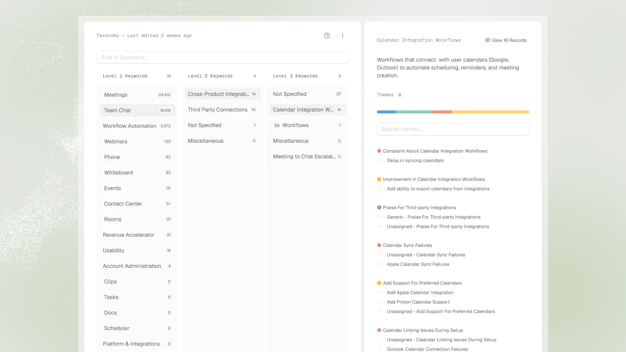 - Creates relationships between feedback, features, customers, and opportunities, enabling questions like “What are enterprise customers saying about onboarding?”