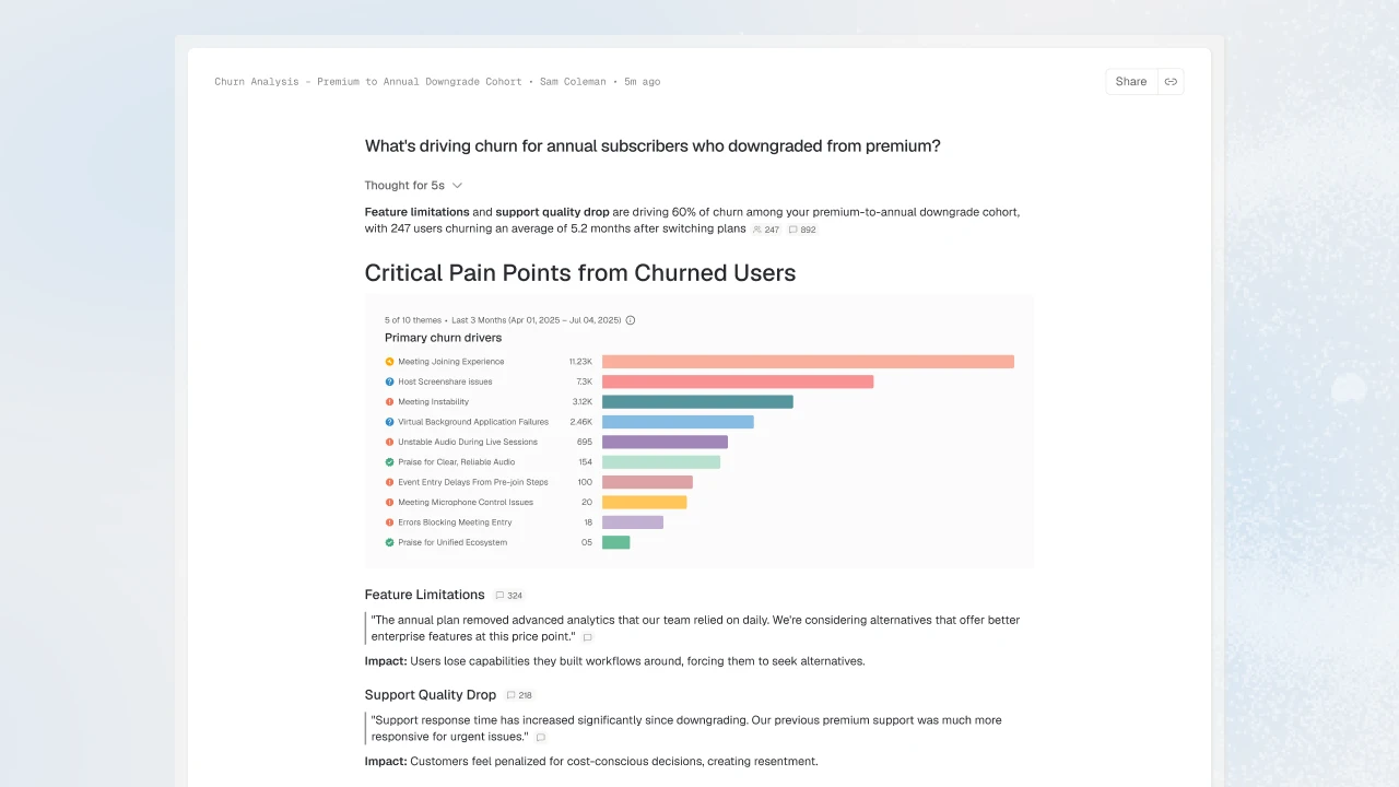 - Lets you query feedback, summarize insights, and analyze trends using natural language.