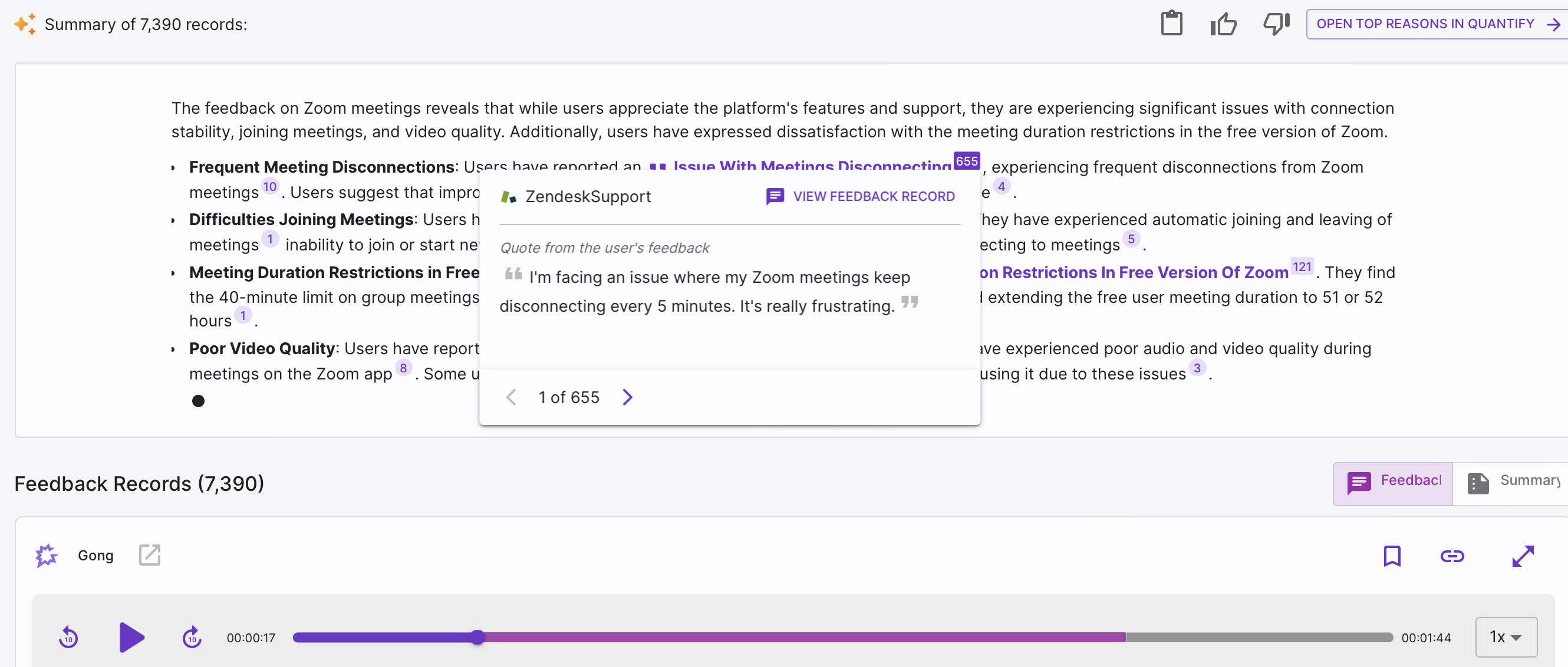 Based on user feedback, we've redesigned the User Quotes Pop-up to eliminate confusion between the user quote and full feedback. We've added contextual queues on hover to clarify the meaning of icons used in the window. The introduction of giant double inverted commas distinctly indicates a snippet from the user’s feedback, not the complete feedback. An improved "View Feedback" CTA with clearer instructions enhances user interaction.