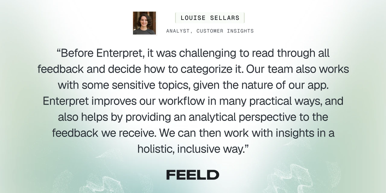 Louise recalls, "Before Enterpret, it was challenging to read through all feedback and decide how to categorize it. Our team also works with some sensitive topics, given the nature of our app. Enterpret improves our workflow in many practical ways, and also helps by providing an analytical perspective to the feedback we receive. We can then work with insights in a holistic, inclusive way.”