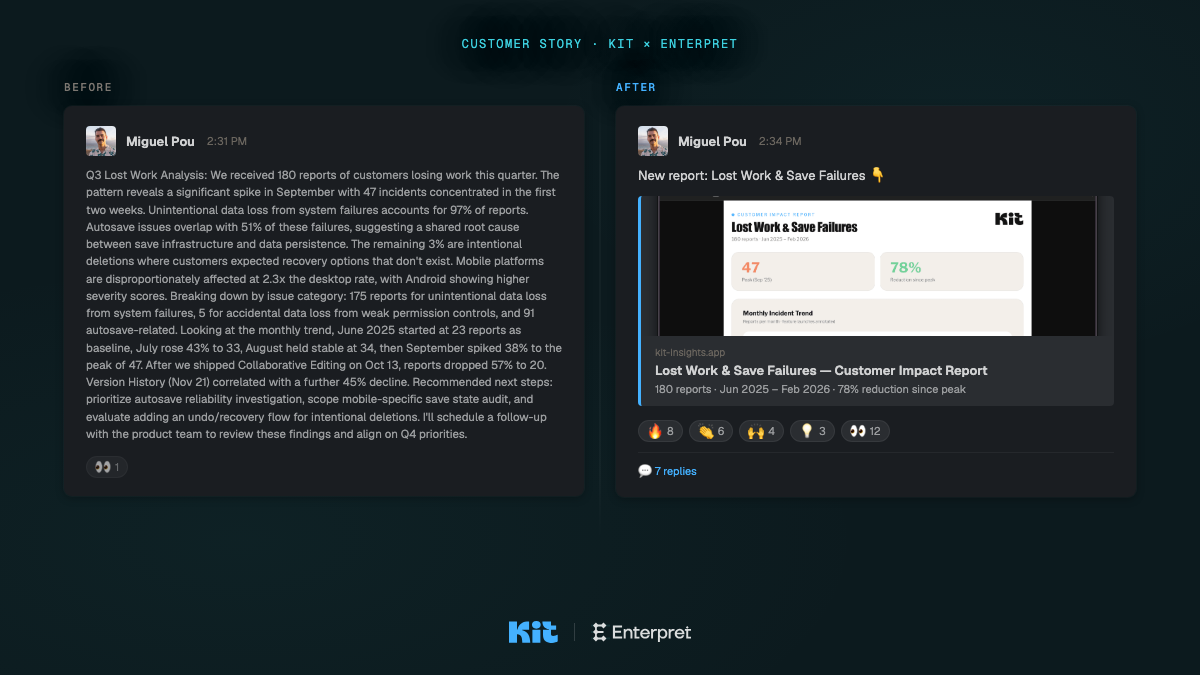 Kit feeds support conversations, Gong calls, social mentions, and Slack community feedback into Enterpret. Miguel sits in the part of the company that talks to customers every day — which is exactly why he became Kit's most effective intelligence producer. And why the last mile became his problem to solve.