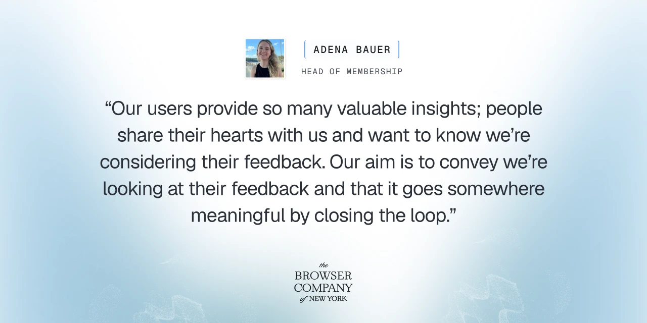 Adena explained the importance of closing the loop at The Browser Company: "Our users provide so many valuable insights; people share their hearts with us and want to know weâre considering their feedback. Our team aims to convey weâre looking at their feedback and that it goes somewhere meaningful by closing the loop.â