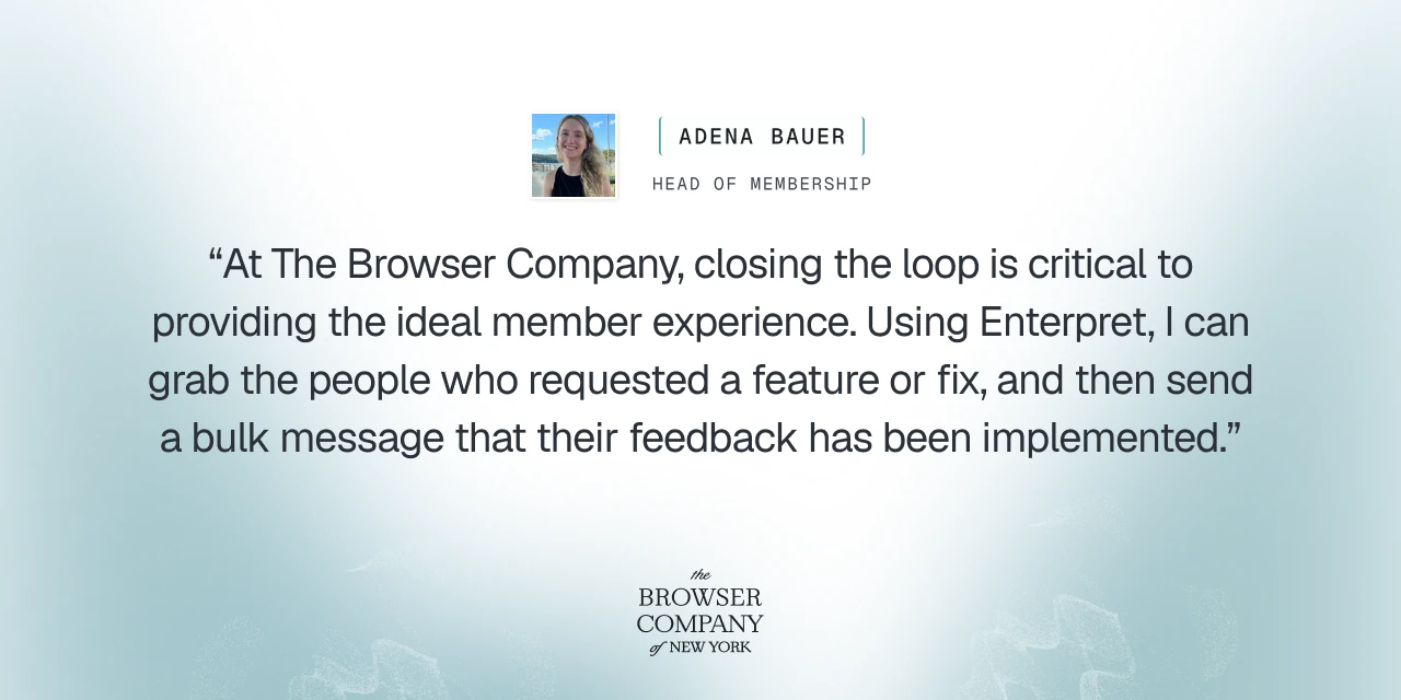 The team uses Enterpret to see who requested certain features in the past to close the loop with members. Adena describes, âAt The Browser Company, closing the loop is critical to providing the ideal member experience. Using Enterpret, I can grab the people who requested a feature or fix and then send a bulk message that their feedback has been implemented.â