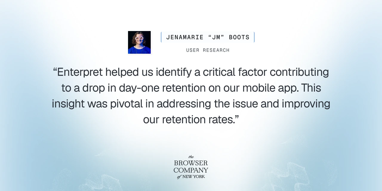 Working with Adena, JM, Callan, Mark, and the entire team at The Browser Company has been crucial in developing and shaping Enterpret. We deeply appreciate working with a team dedicated to building a product with its members. As The Browser Company continues to disrupt and push boundaries in the browser industry, we are thrilled to be alongside them, providing support every step of the journey!