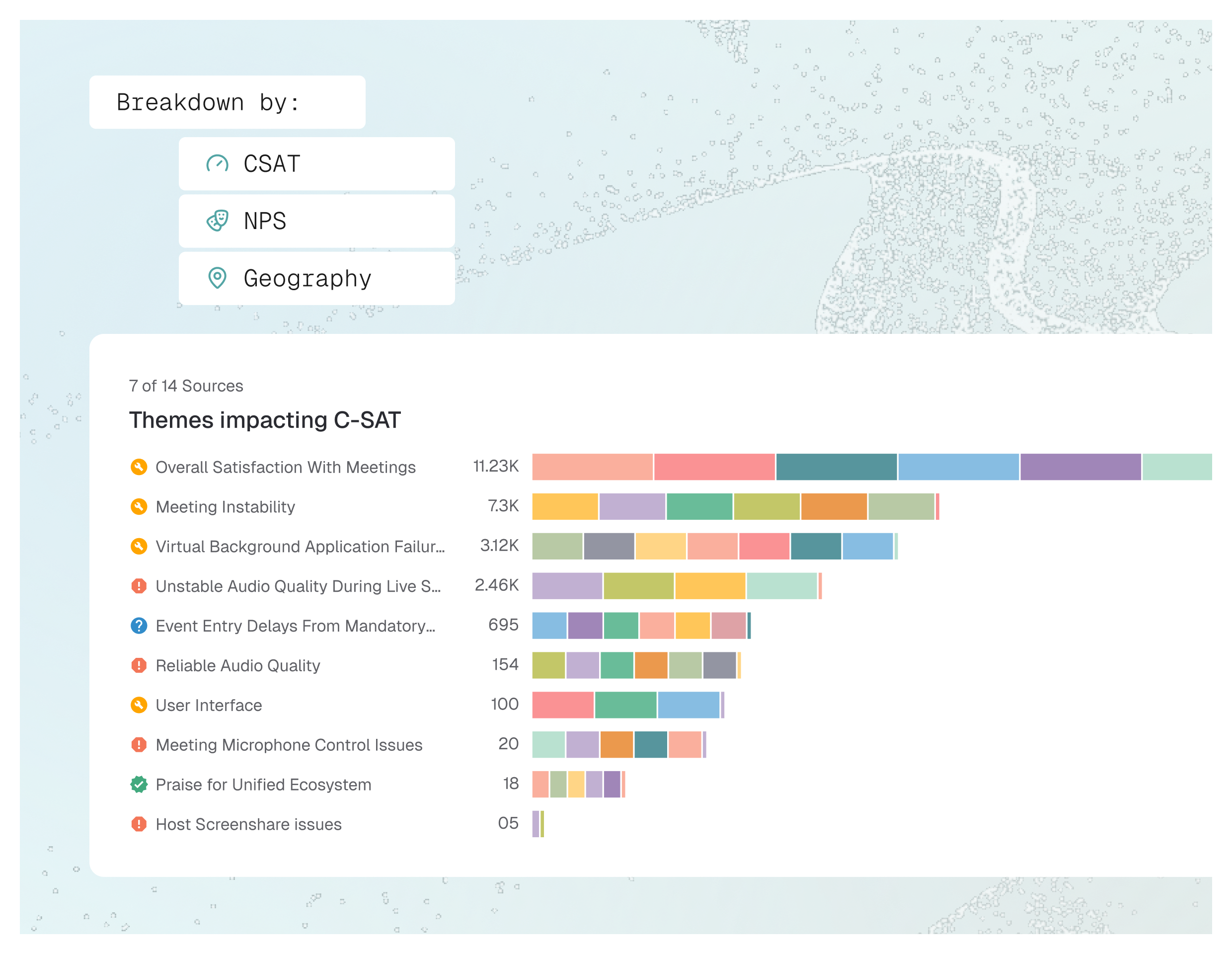 Rank themes by ARR, CSAT, NPS impact, not just volume. Slice by dimensions, no SQL