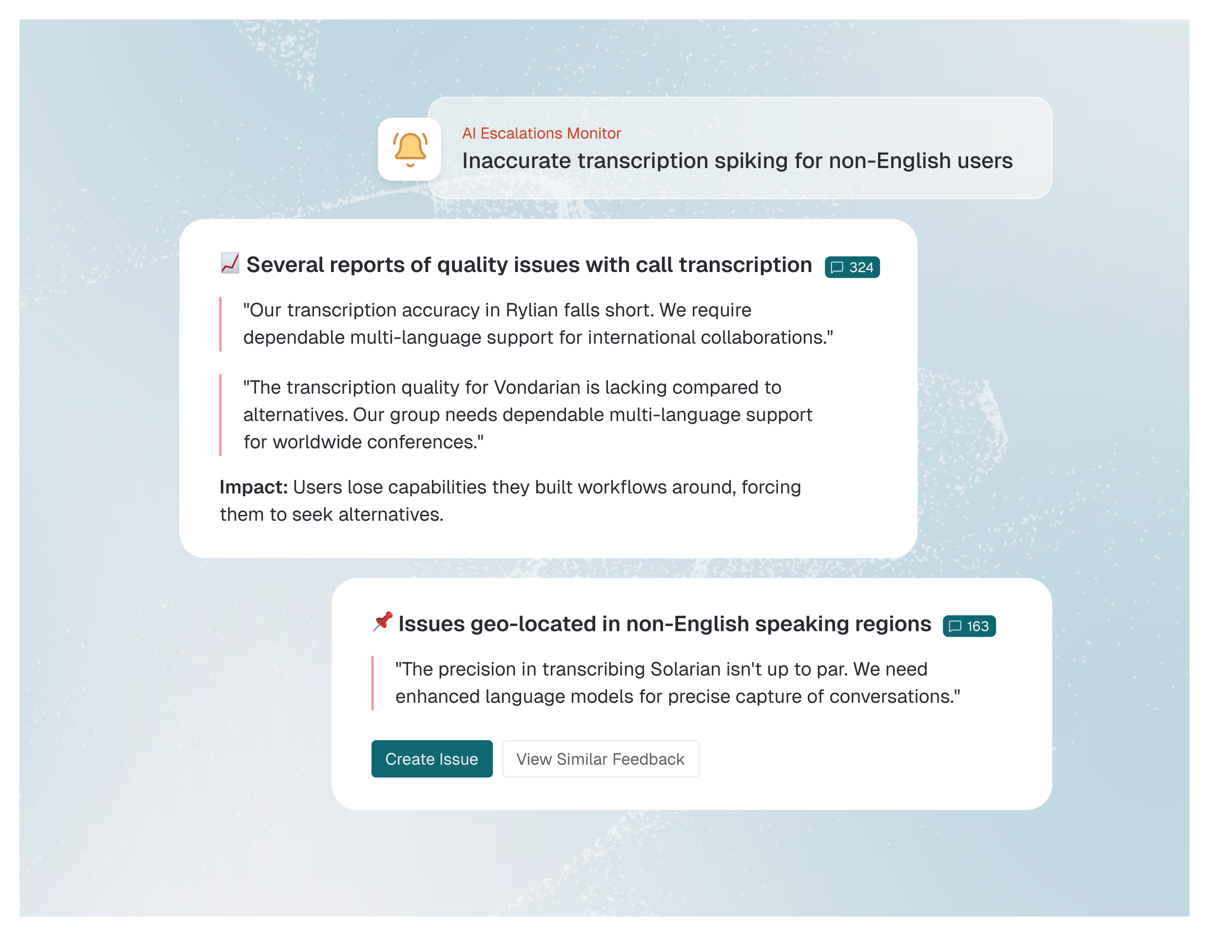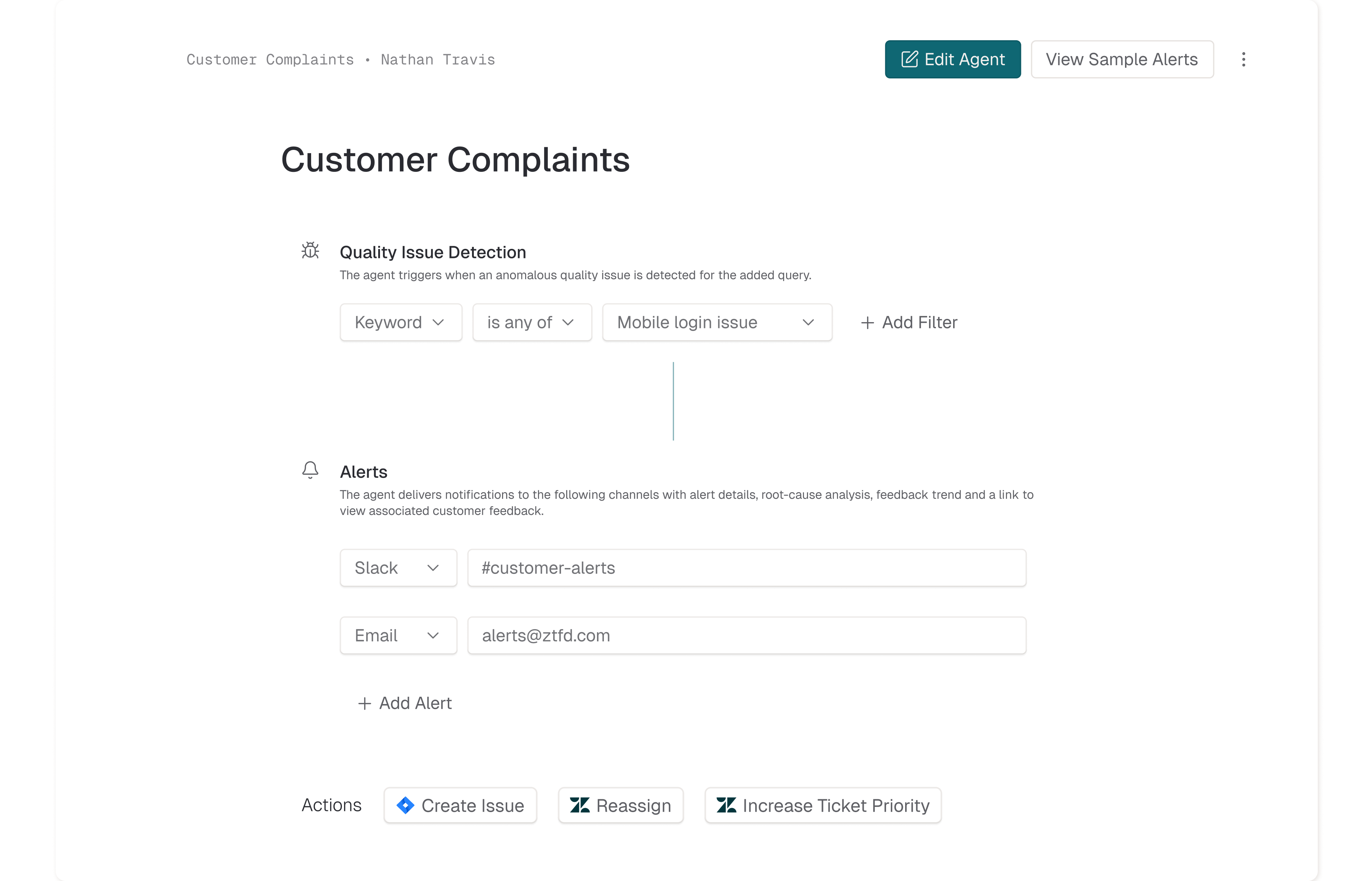 Apply AI-powered detection to identify anomalies, sentiment shifts, volume spikes, and risk indicators. Each agent specializes in specific patterns: quality issues, churn signals and escalation risks so nothing critical slips through.