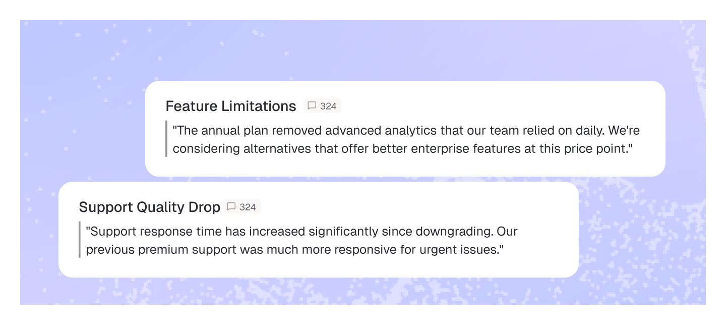 Reviews 100% of your feedback corpus (not just a small sample) for complete answers