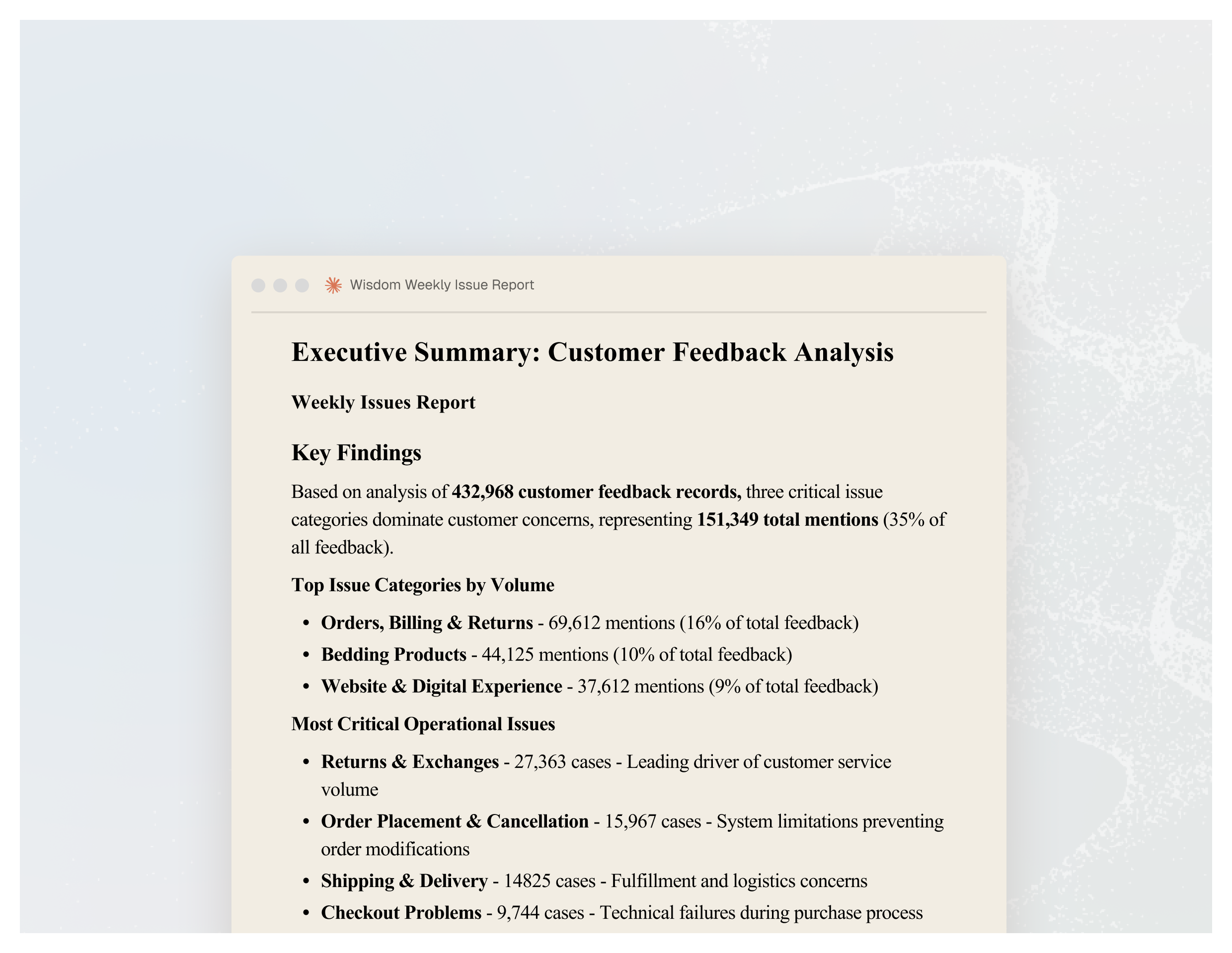 Jump from any chart to Feed. Toggle between verbatim feedback or AI Summary, compare cohorts, and use embedded Wisdom to explain the “why” with grounded answers.