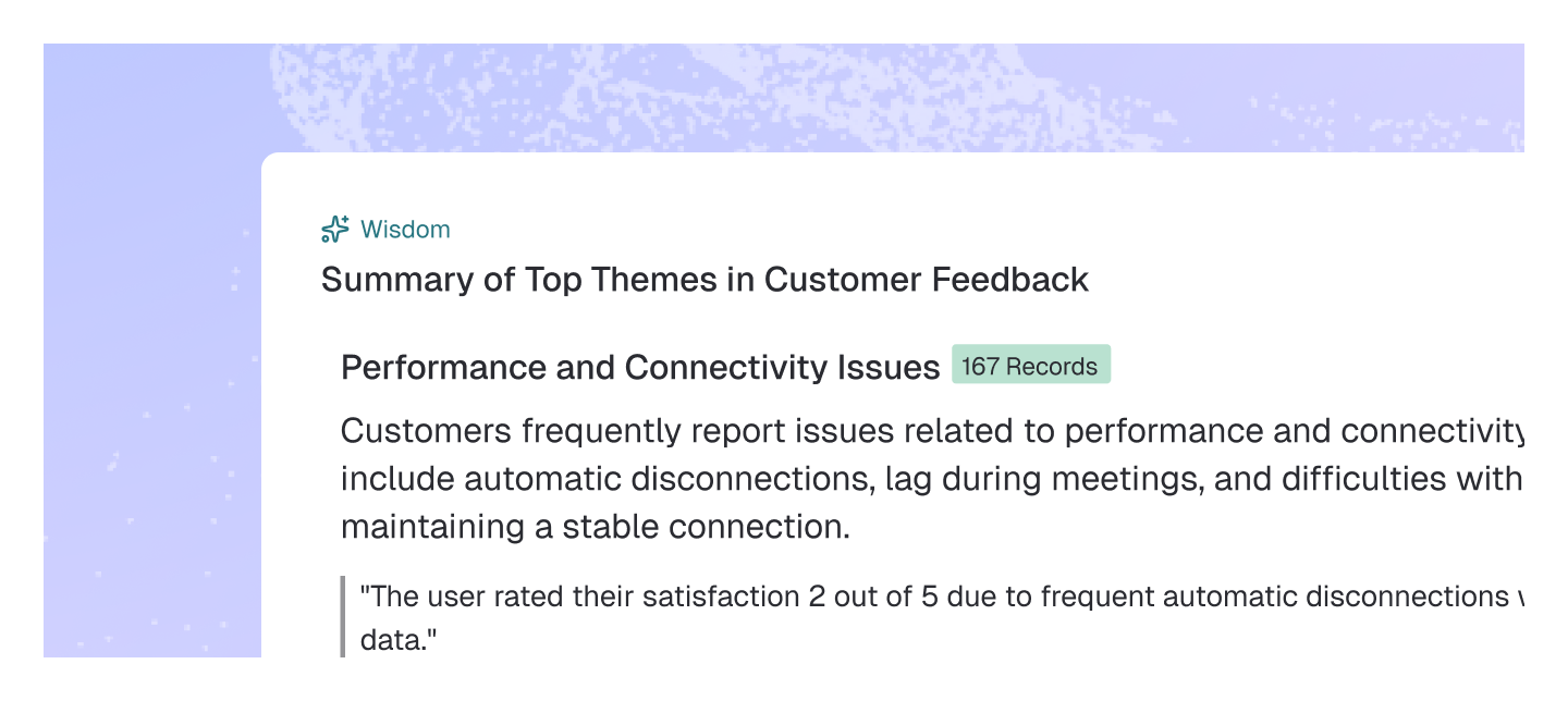 Jump from any chart to Feed. Toggle between verbatim feedback or AI Summary, compare cohorts, and use embedded Wisdom to explain the “why” with grounded answers.