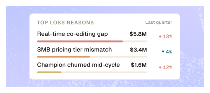 See what product gaps or use cases lead to wins vs. losses, so you can quickly improve.