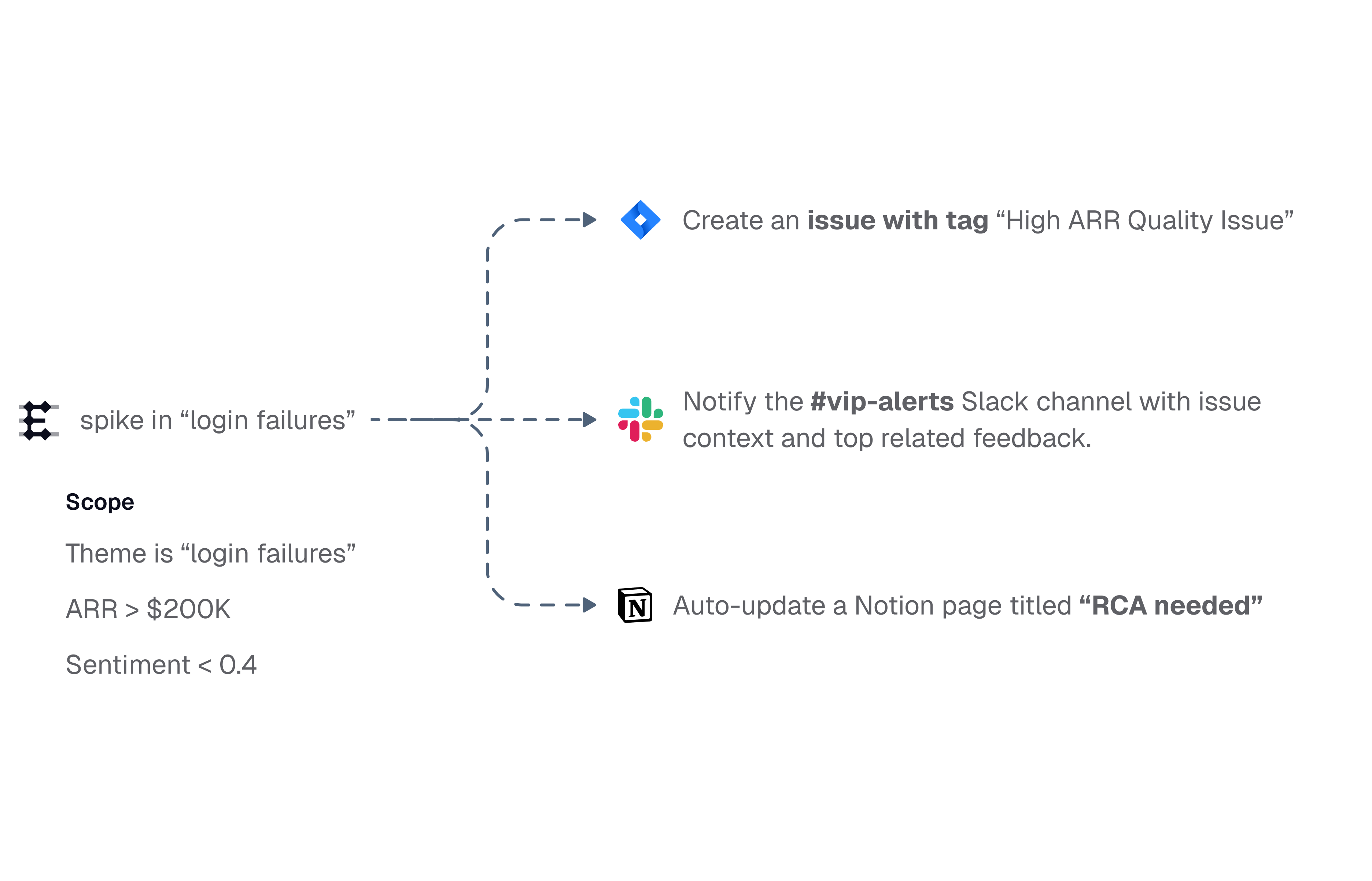Let AI Agents watch feedback 24/7 for spikes, sentiment shifts, escalations, churn risk, or custom patterns. Compose triggers using sentiment, revenue impact, account tier, product area, and more.