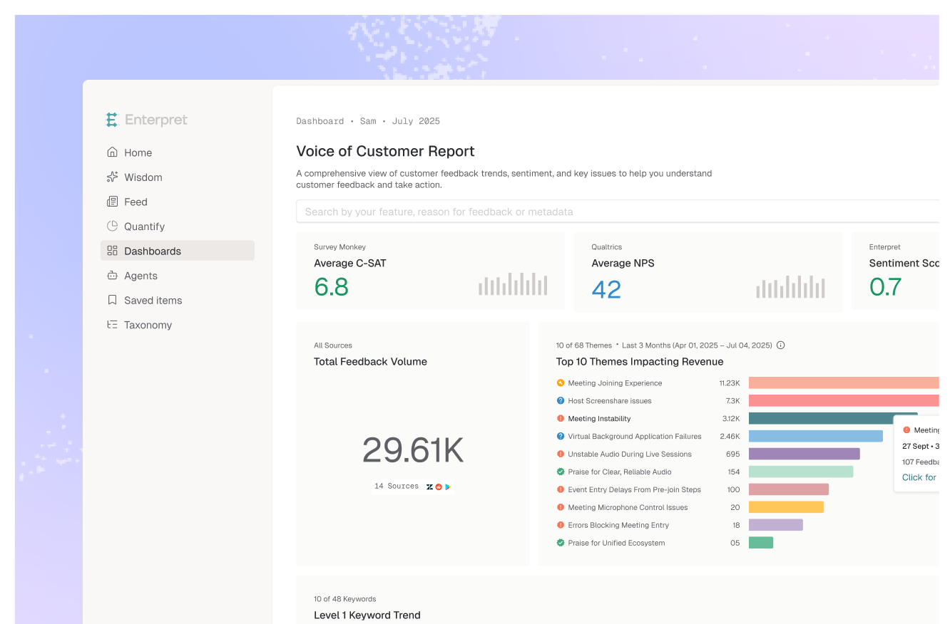 - Dashboard Reporting: Processed insights appear in your Enterpret dashboard alongside other feedback sources