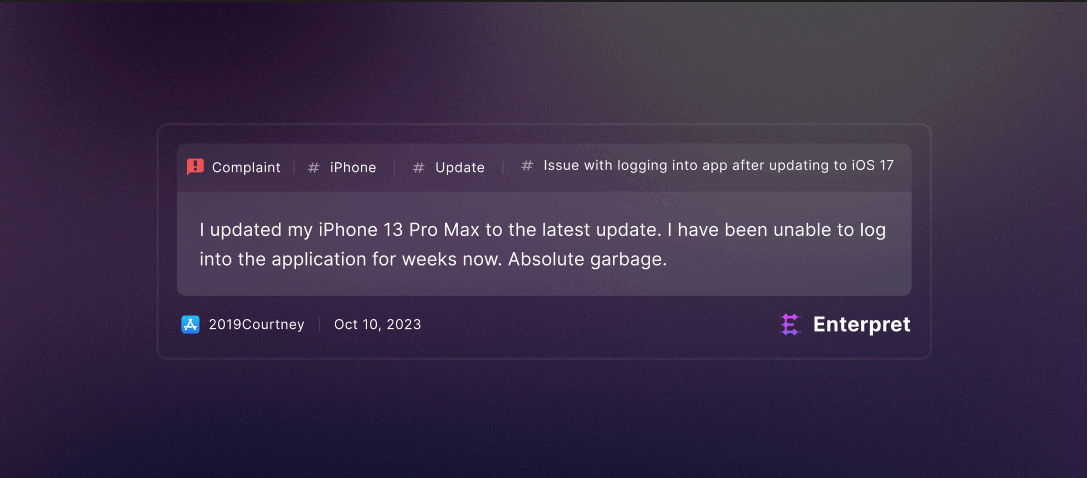 The Starbucks app is well-rated: 4.9 stars from 978K ratings in the Play Store, and 4.8 stars from 257K ratings in the App Store. But there seems to be a consistent complaint from users that they are unable to log in to the app, especially after the frequent forced updates. And it’s getting worse. At Enterpret, we are passionate about customer feedback, so we ingested data from some of Starbucks’ public customer data sources, trained our models to identify what customers are talking about, and did some digging. Pretty quickly I found a distinct cluster of complaints touching on the interconnected topics of logging in, managing passwords, and updating the app.