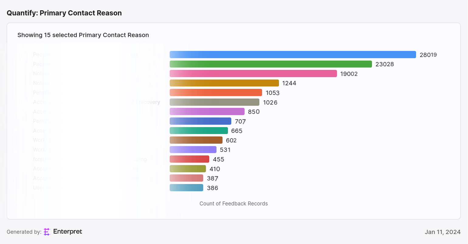 📊 Notion Tip: Look at the Top 15 Reasons filtered to different Cohort (Enterprise, Standard, Free, etc.) to provide a quick visualization of the top reasons for feedback. Example below.