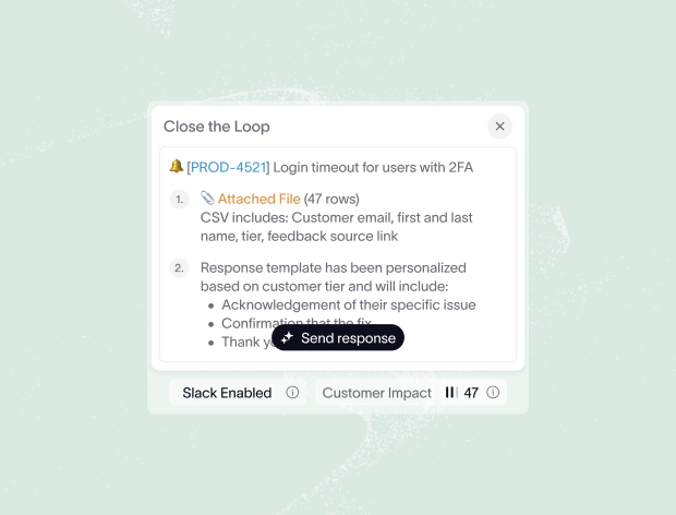 Critical bugs become Jira tickets. Feature requests flow to Linear. Customer wins get shared in Slack. Intelligence flows where decisions happen.